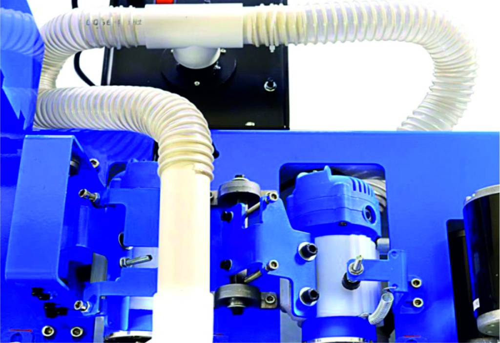 Фрезерный узел с высокооборотистыми фрезами, производит снятие свесов кромки сверху и снизу заготовки за один проход.